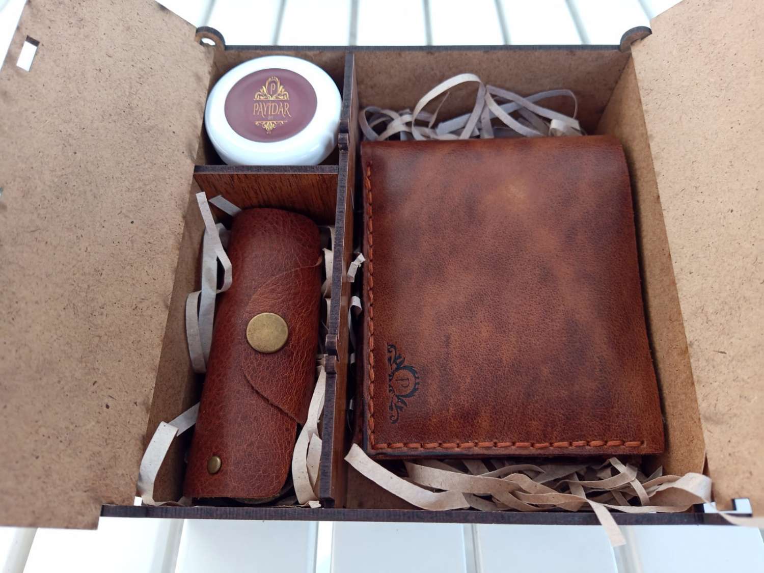 - Ürünümüz Payidar Cüzdan, Anahtarlık, Bakım kremi set şeklinde ahşap özel kutuda gönderilmektedir.
